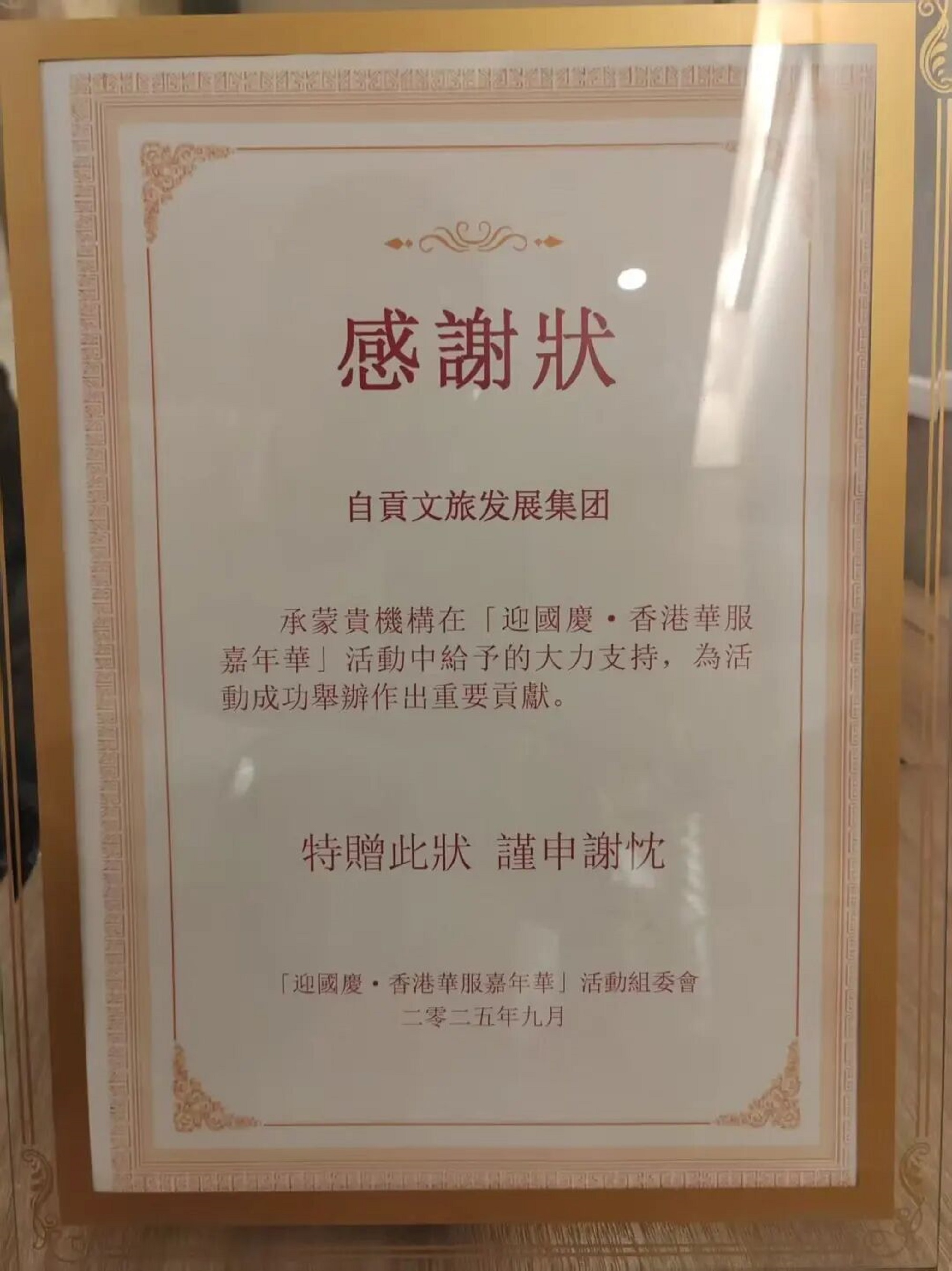 活动现场,霍启刚代表组委会向自贡文旅集团颁发感谢状。自贡文旅集团表示将持续发力——自贡彩灯承载千年文化底蕴,凝聚无数工匠心血,既是艺术瑰宝,也是文化交流使者。此次华服彩灯嘉年华,愿为广大香港市民呈现最优的中华彩灯作品,传递中华优秀传统文化魅力!