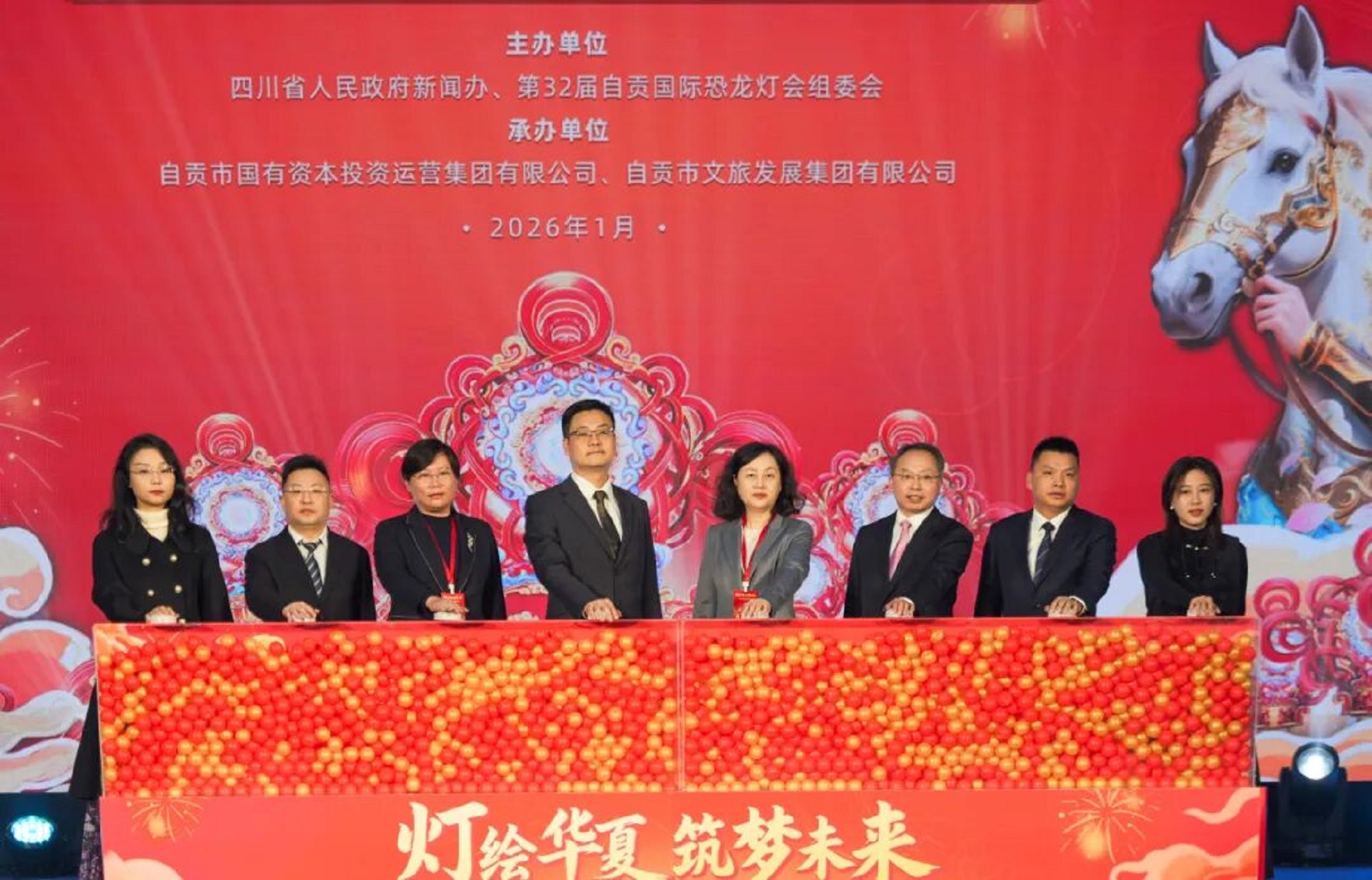 发布会上,自贡市文化广播电视和旅游局局长陈金洪介绍,“自贡灯会”作为国家级非物质文化遗产,享有“天下第一灯”的美誉,为中国春节成功申遗贡献了重要力量。本届灯会以“灯绘华夏”为脉络,将彩灯、扎染、剪纸等非遗技艺与华夏神话史诗、经典历史故事深度结合。围绕马年新春意象,众多民间故事、上古传说和民俗元素将在灯会中得以精彩呈现,展现了一幅“万象共生”的艺术长卷。