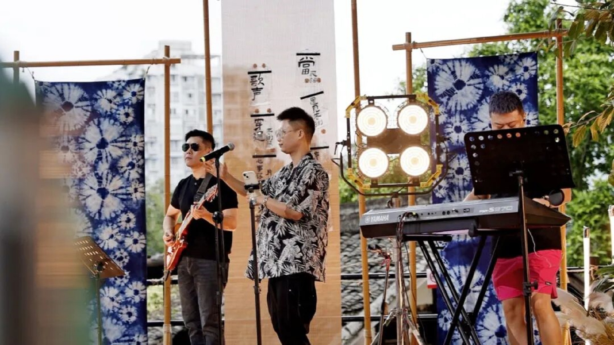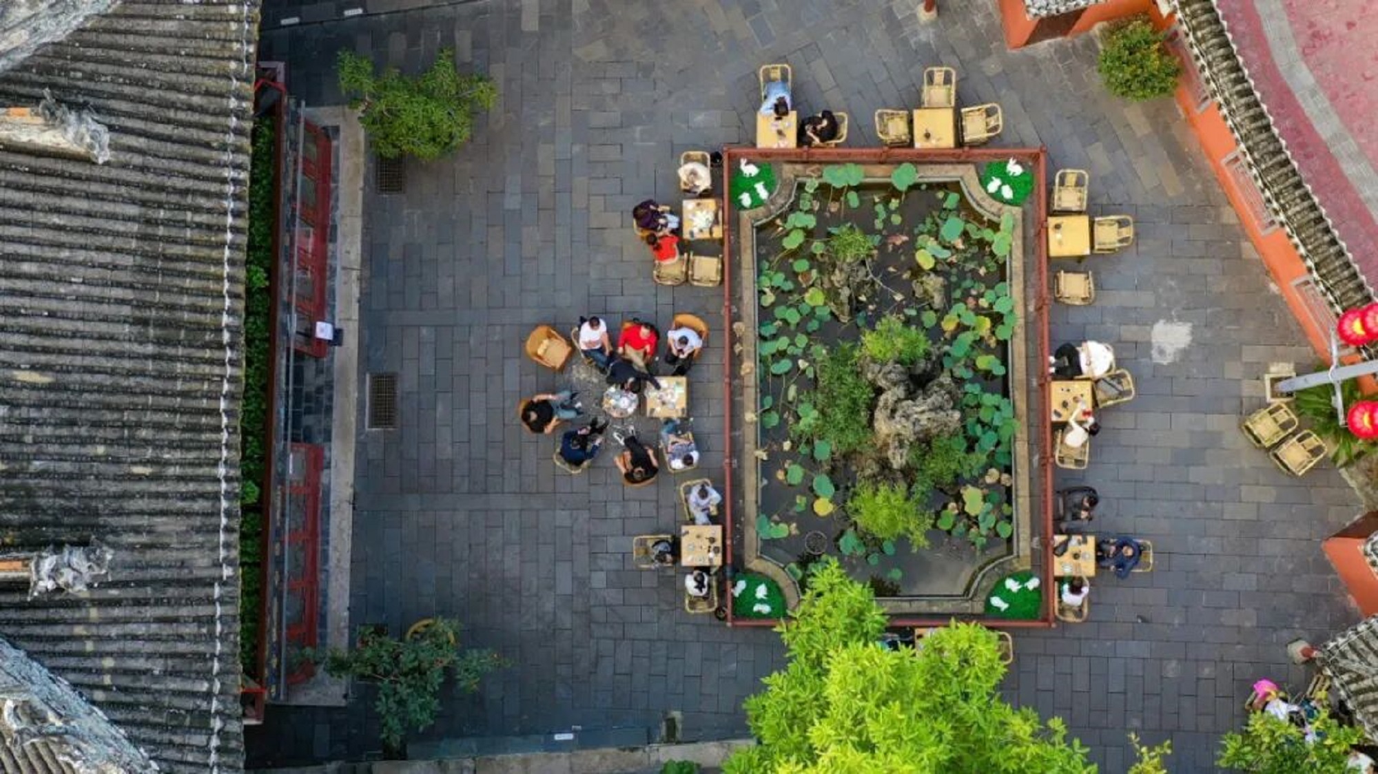 它依山傍水盘踞釜溪河畔,穿斗木结构搭配飞檐翘角,尽显川南古建筑韵味,曾是盐商祭祀祈福、商议盐业事务的重要场所,如今已经成为喝茶,观看长嘴铜壶茶艺表演、体验非遗扎染的地方。