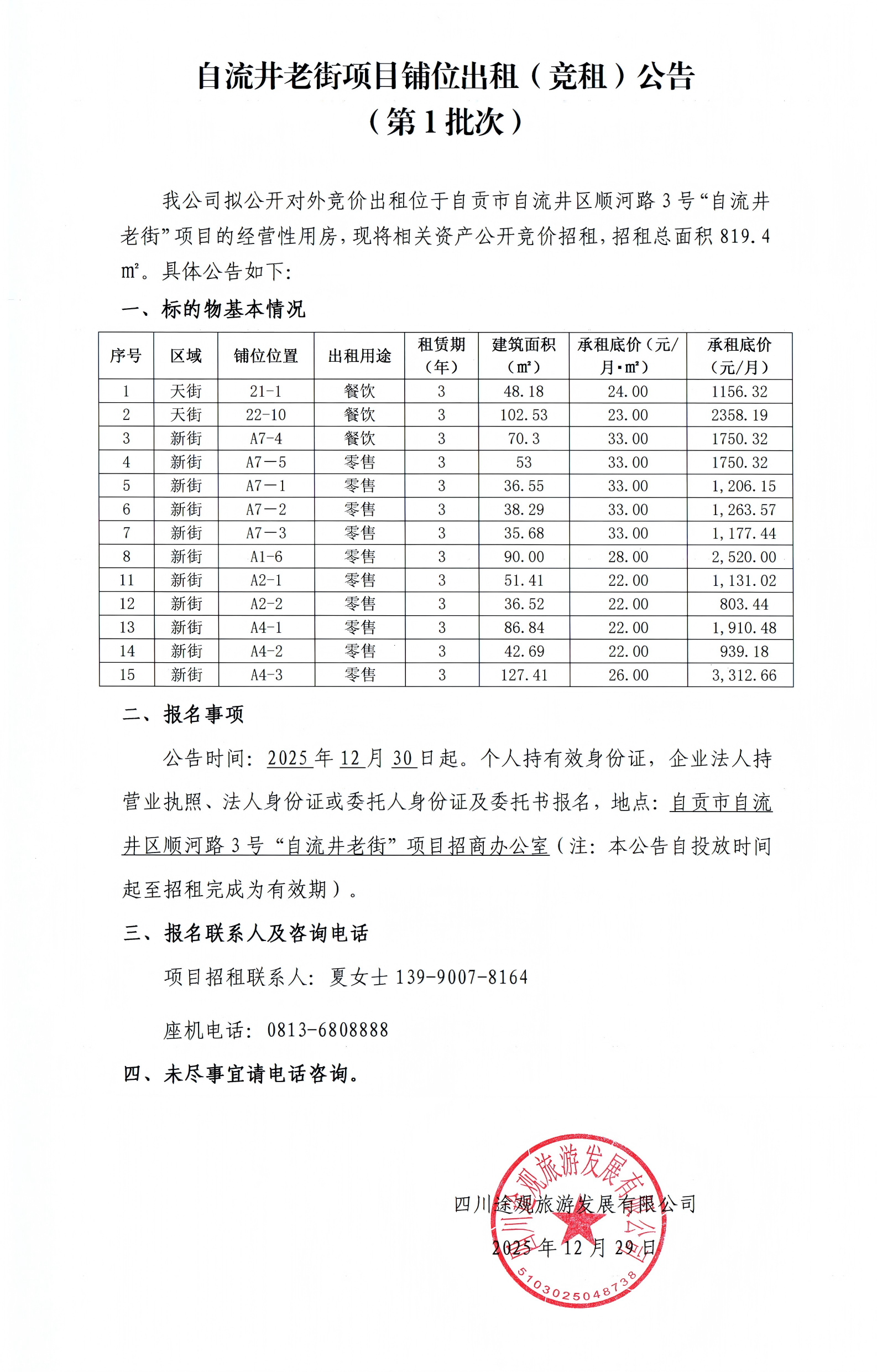 自流井老街项目铺位出租(竞租)公告(第1批次)