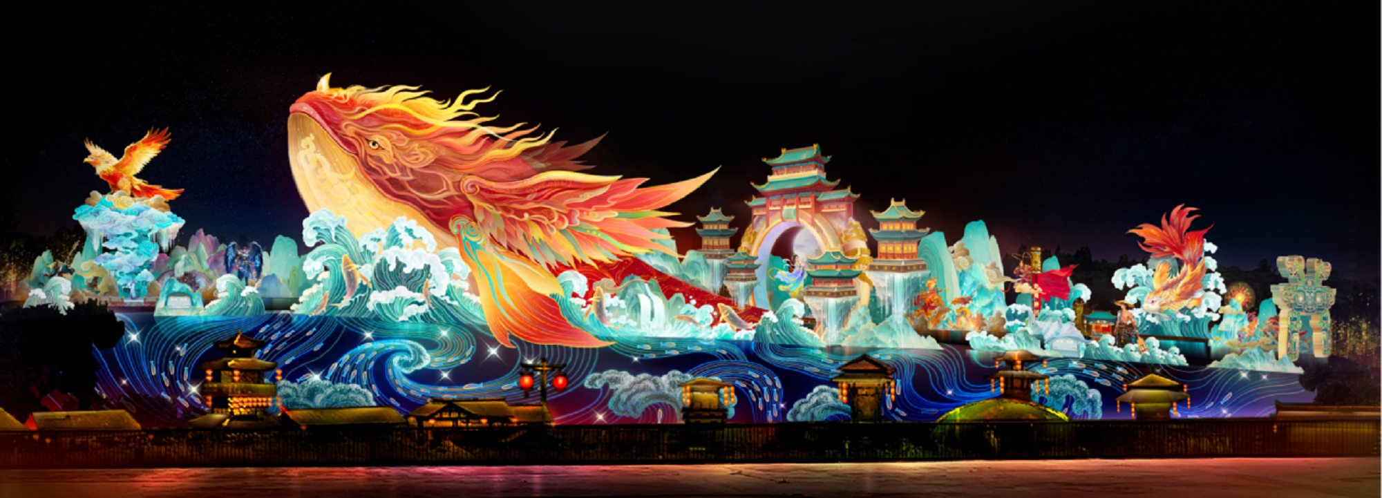 作为本届灯会的“C位”灯组,“神奇华夏”以《庄子·逍遥游》中“鲲鹏”的宏大意象为蓝本,整体长约210米,以古典神话为表现形式,通过讲述“神话源起”“九天探宇”“智联万物”“陆海驰骋”的故事,彰显祖国的繁荣富强和华夏民族的壮志豪情。