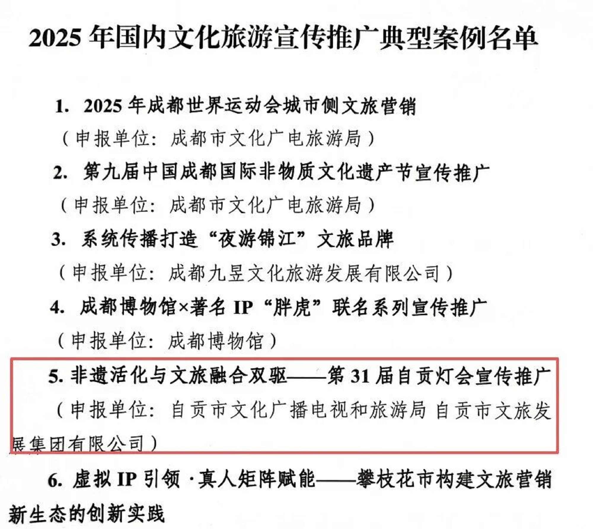 近日,在文化和旅游厅组织开展的2025年国内文化旅游宣传推广典型案例评选活动中,由自贡市文化广播电视和旅游局、自贡市文旅发展集团有限公司选送的“非遗活化与文旅融合双驱——第31届自贡灯会宣传推广”宣传推广案例,成功被列入2025年国内文化旅游宣传推广典型案例名单。