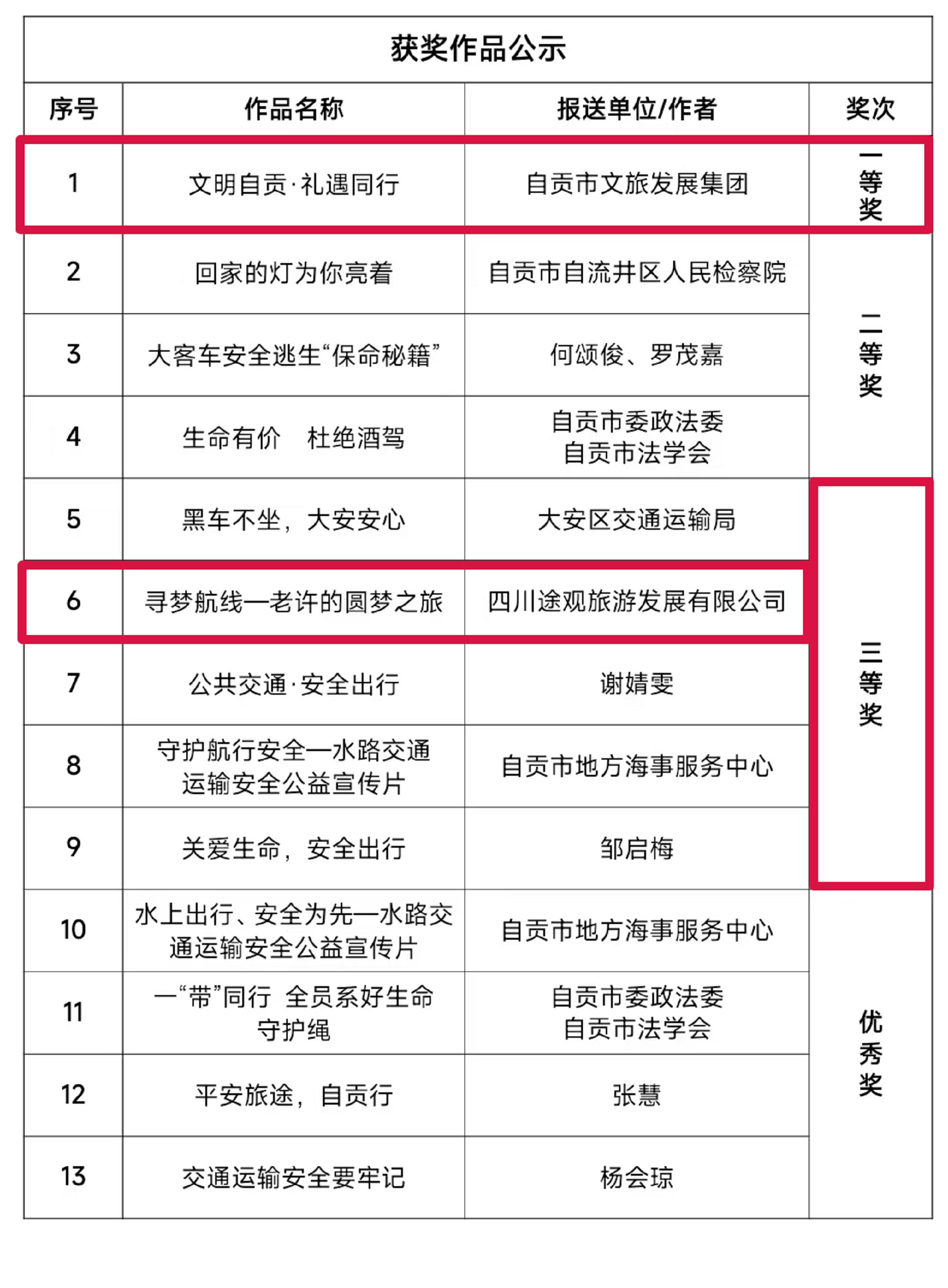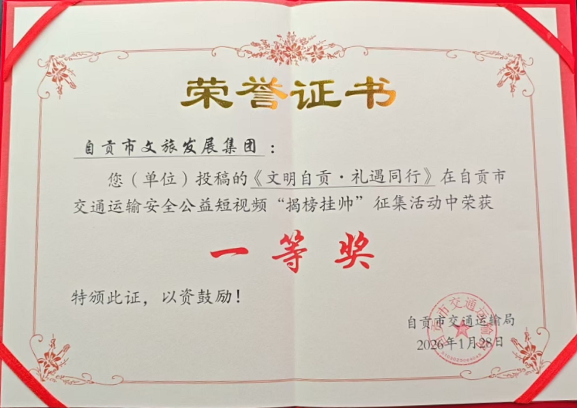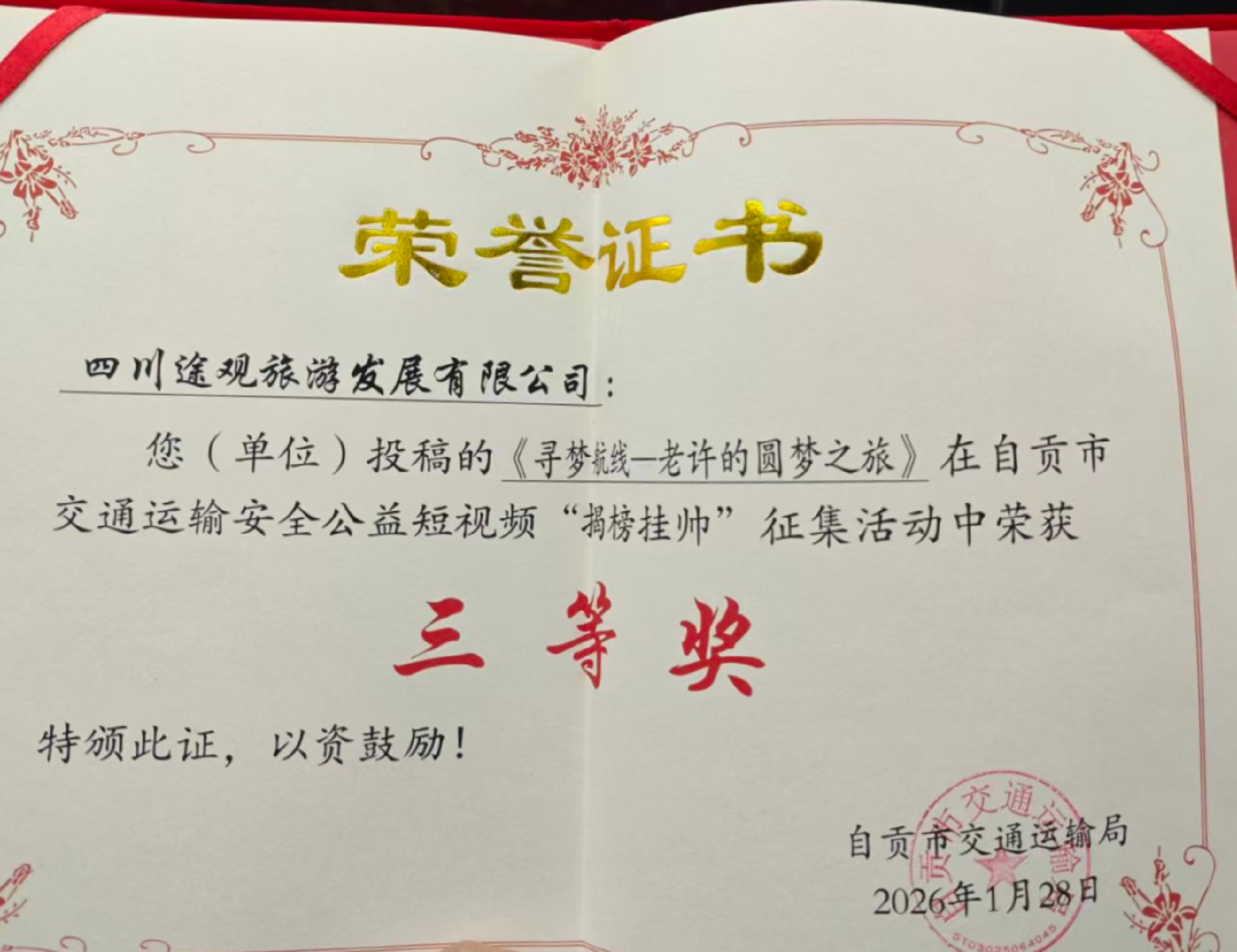 自贡市交通运输局“交通运输安全公益短视频”大赛评选结果正式揭晓。市文旅发展集团精心拍摄制作的公益视频《文明自贡·礼遇同行》凭借贴合主题的内容呈现与细腻的创作表达,荣获大赛一等奖;集团旗下四川途观旅游发展公司的参赛作品《寻梦航线——老许的圆梦之旅》,以生动的叙事传递安全理念,收获三等奖。