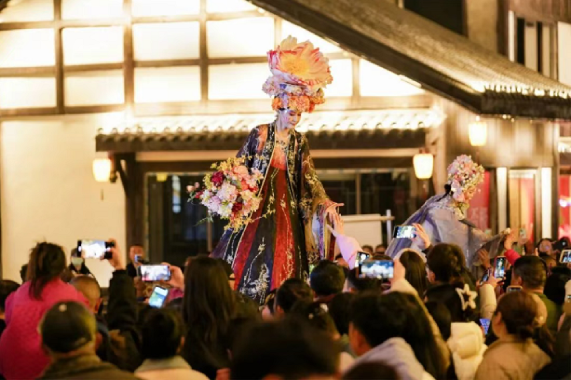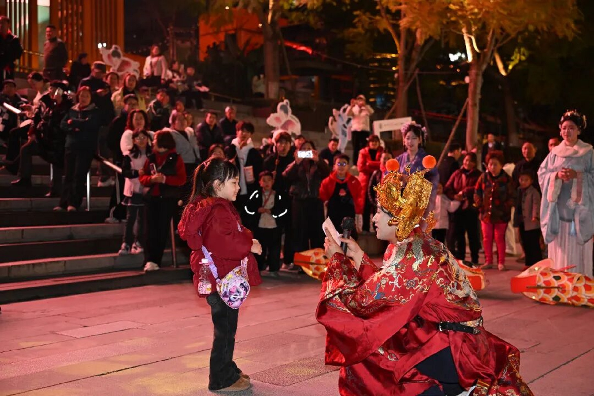 东方神怪艺术展、28米巨型“飞龙马”、互动式“跑马灯”等互动艺术装置,为游客朋友们打造了一场流光溢彩的灯河梦境。更有超180场山海经主题戏剧在老街街巷中轮番上演。从日暮到夜深,神祇异兽穿梭于古建筑群间,以高跷、环境戏剧等多元形式,构建起一座没有边界的“移动剧场”,让游客在一步一景中邂逅东方奇幻。