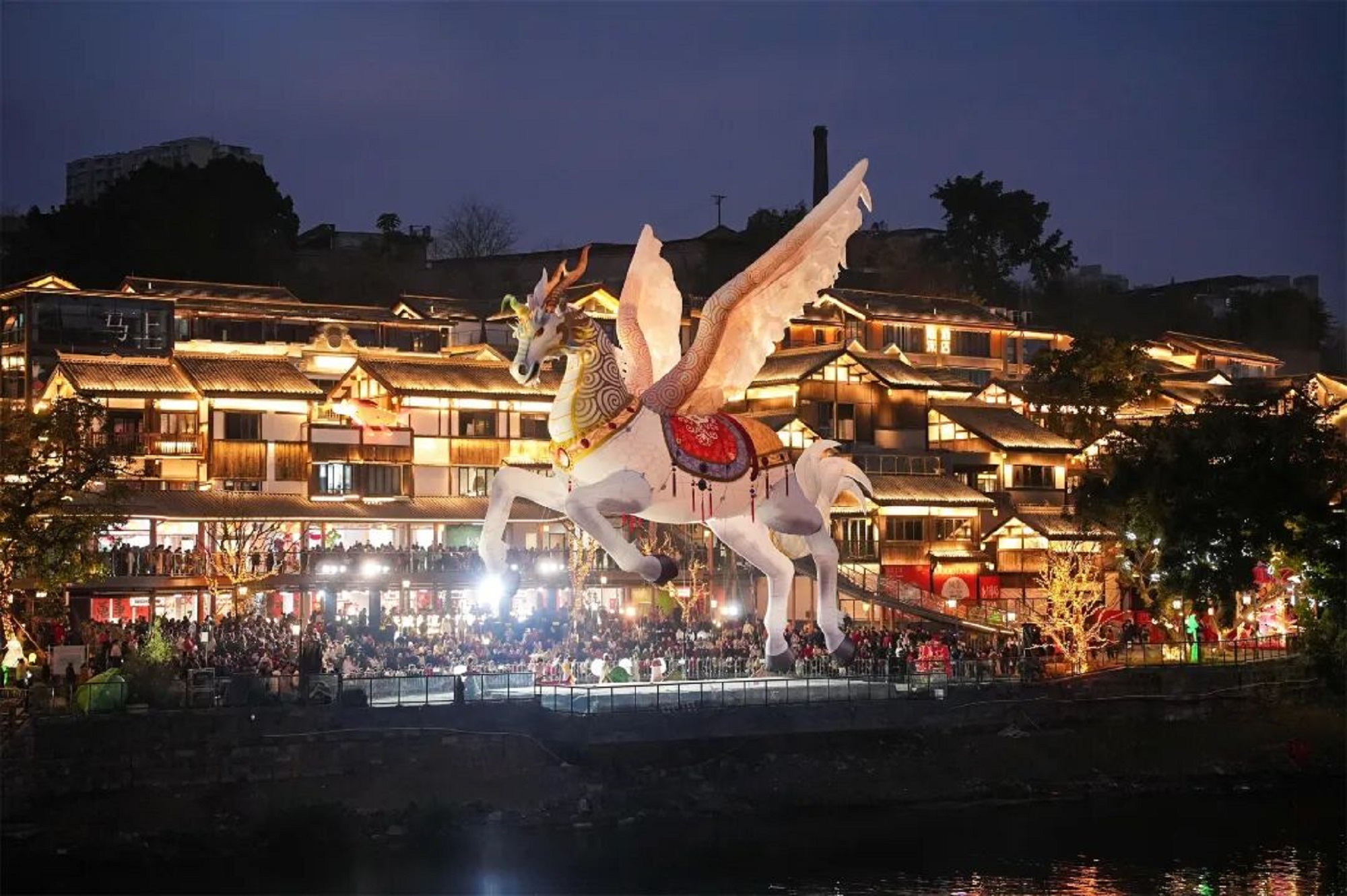 本届灯会以“灯绘华夏 筑梦未来”为主题,汇聚11组超大型灯组、200余组中小型灯组,不仅将非遗彩灯技艺、华夏神话史诗、现代数字科技、传统春节年味与巴蜀民俗风情深度融合,还有全园区互动演艺、震撼无人机秀、沉浸式NPC剧本游以及“鲲鹏巡游灯”轮番亮相,为海内外游客献上了一场流光溢彩、气势恢宏的光影盛宴。