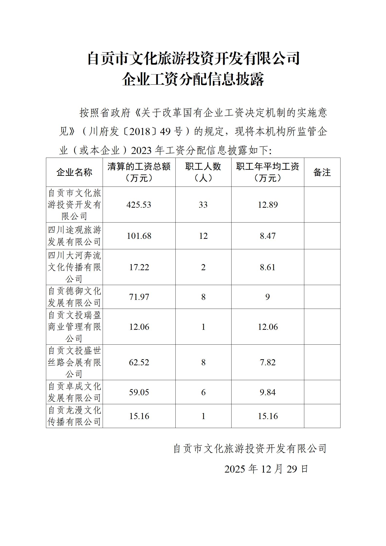 自贡市文化旅游投资开发有限公司 企业工资分配信息披露