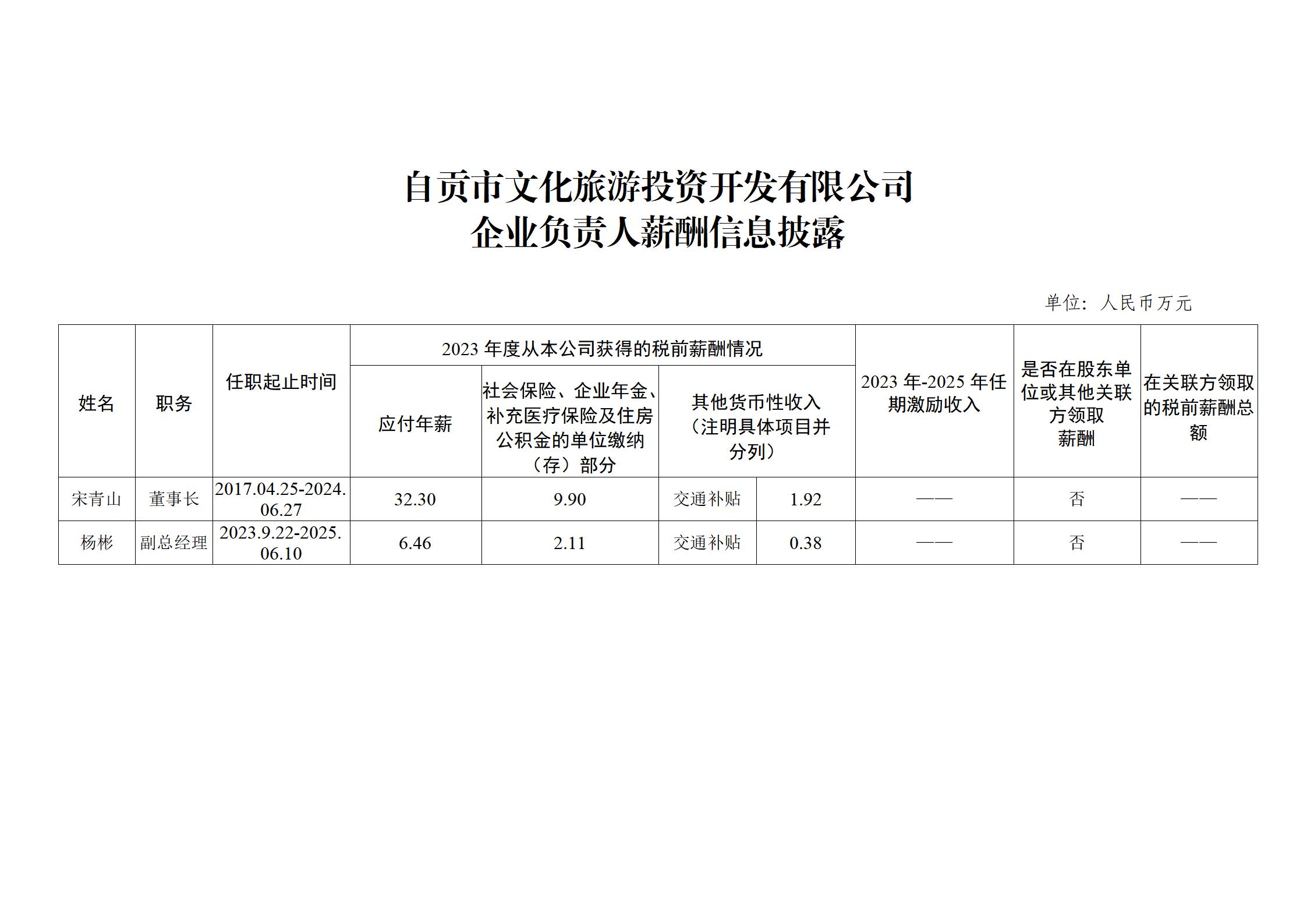 自贡市文化旅游投资开发有限公司 企业负责人薪酬信息披露